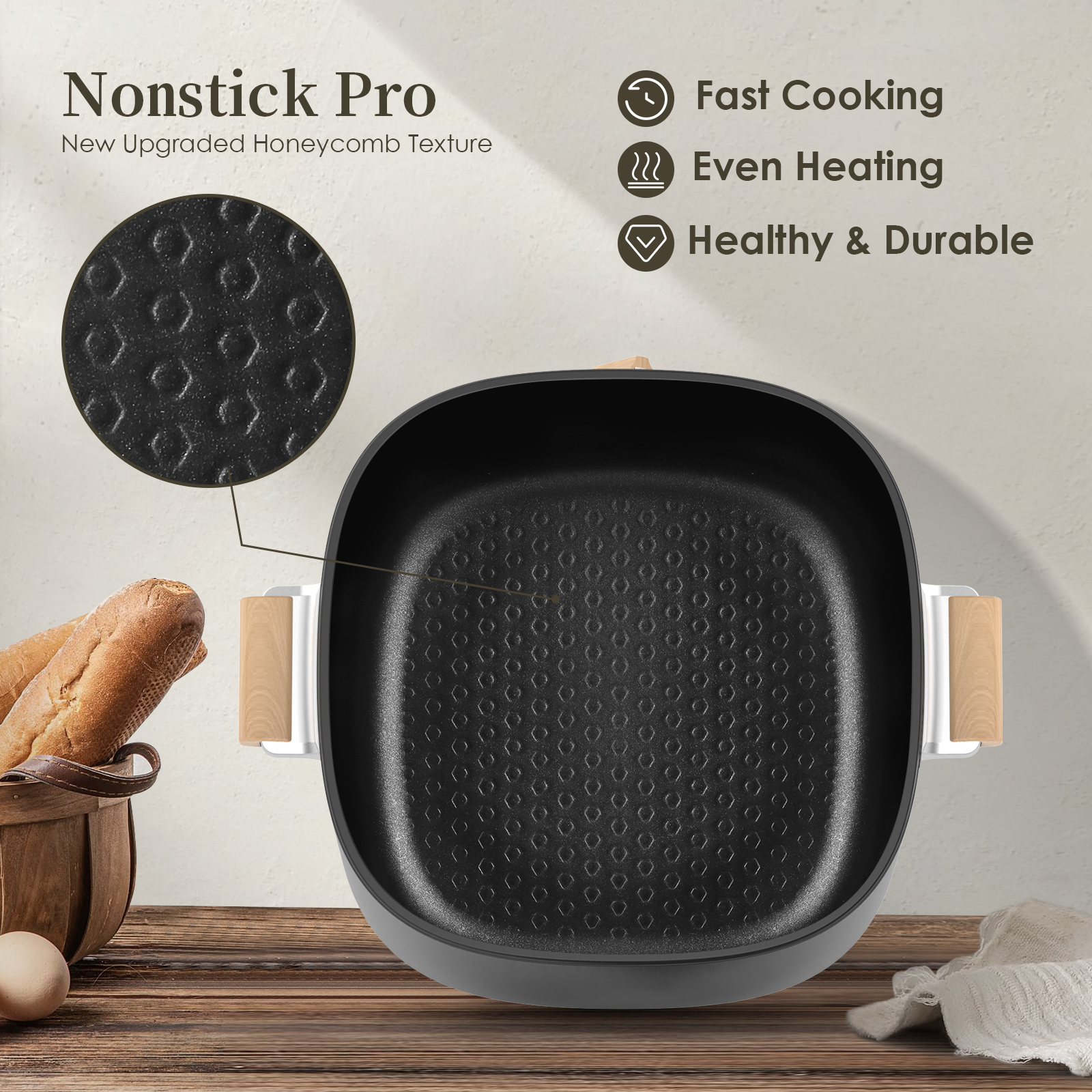 Easy to Clean and Ergonomic Design: The food-grade non-stick coating prevents food from sticking and ensures easy cleaning. Non-slip handle and bottom design provide stability, while the visual glass lid and steam vent enhance cooking convenience.