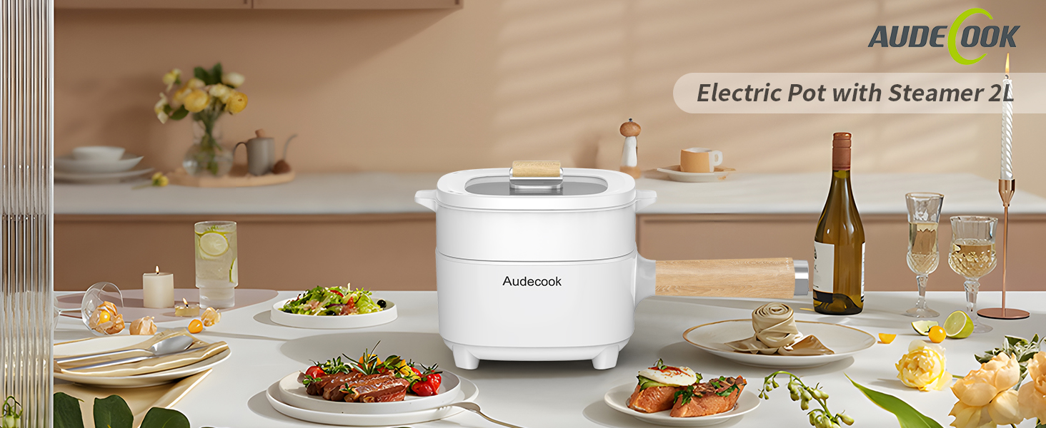Audecook 8" Electric Pot with High Rim 2.1" is designed for professional multi-cooking purposes, steaming above and cooking below, vegetables and meat can be cooked together or separately in the removable steamer insert (but always is lightly) cooking. Essential vitamins and nutrients are not lost and keep an intense taste.